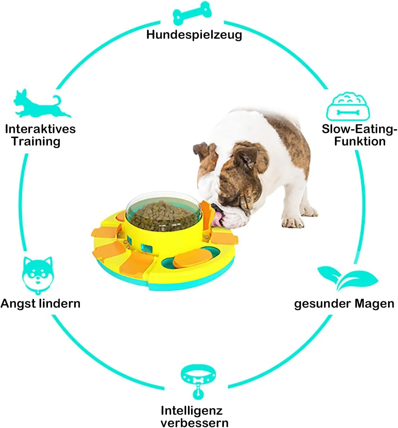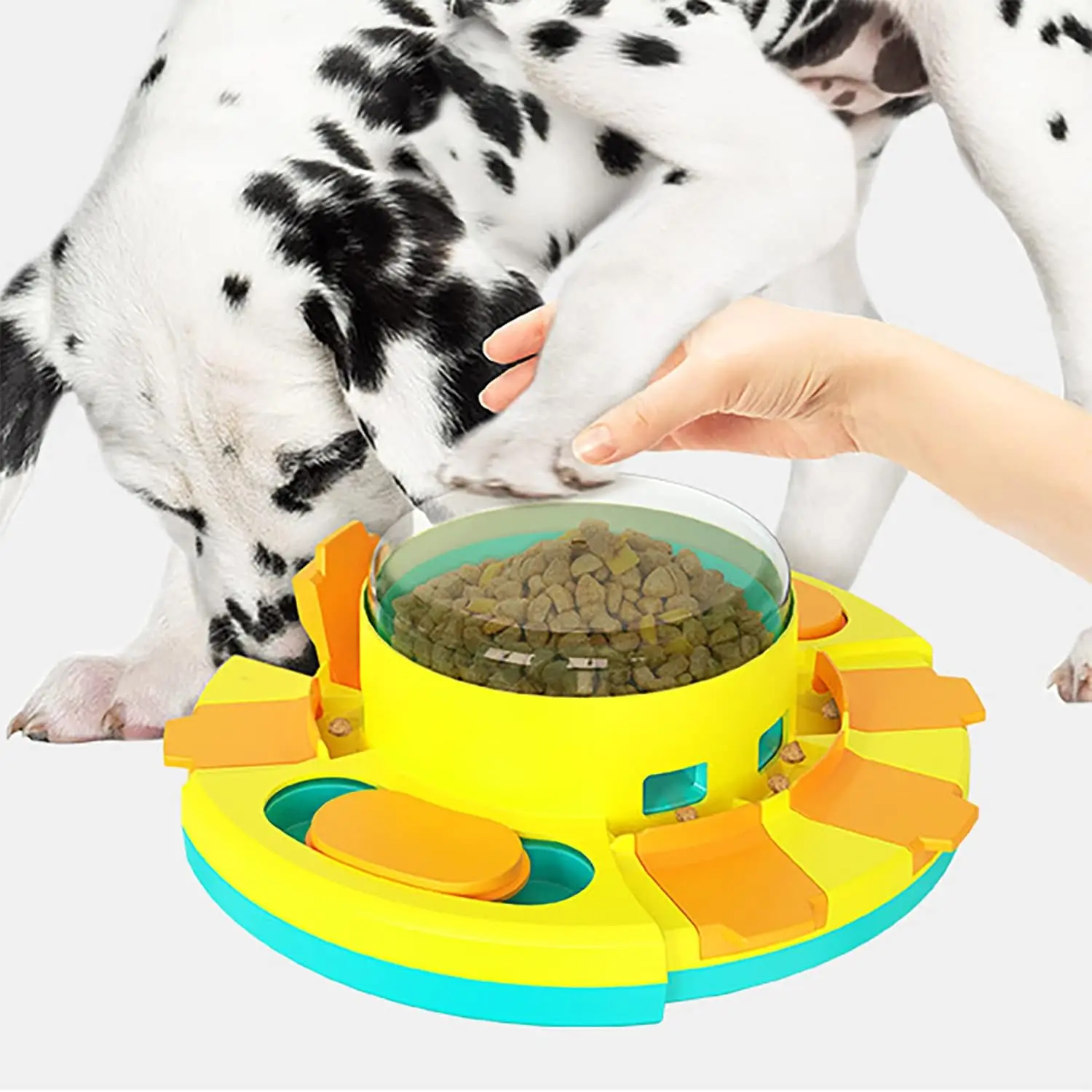 Interactive dog treat dispenser with 8 treat compartments that promote slow eating, mental stimulation, and fun training sessions. 🐾